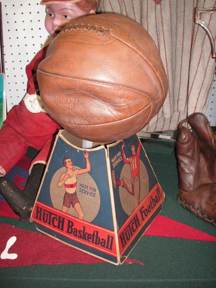 advertising stand for displaying Hutch brand basketballs or footballs.
