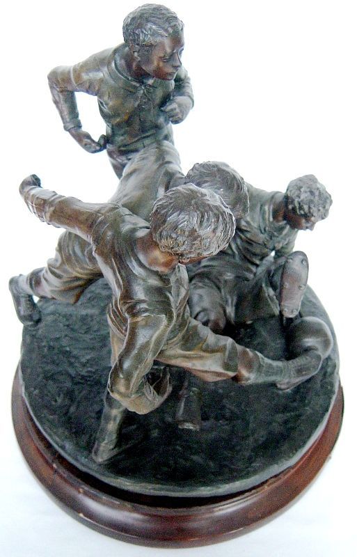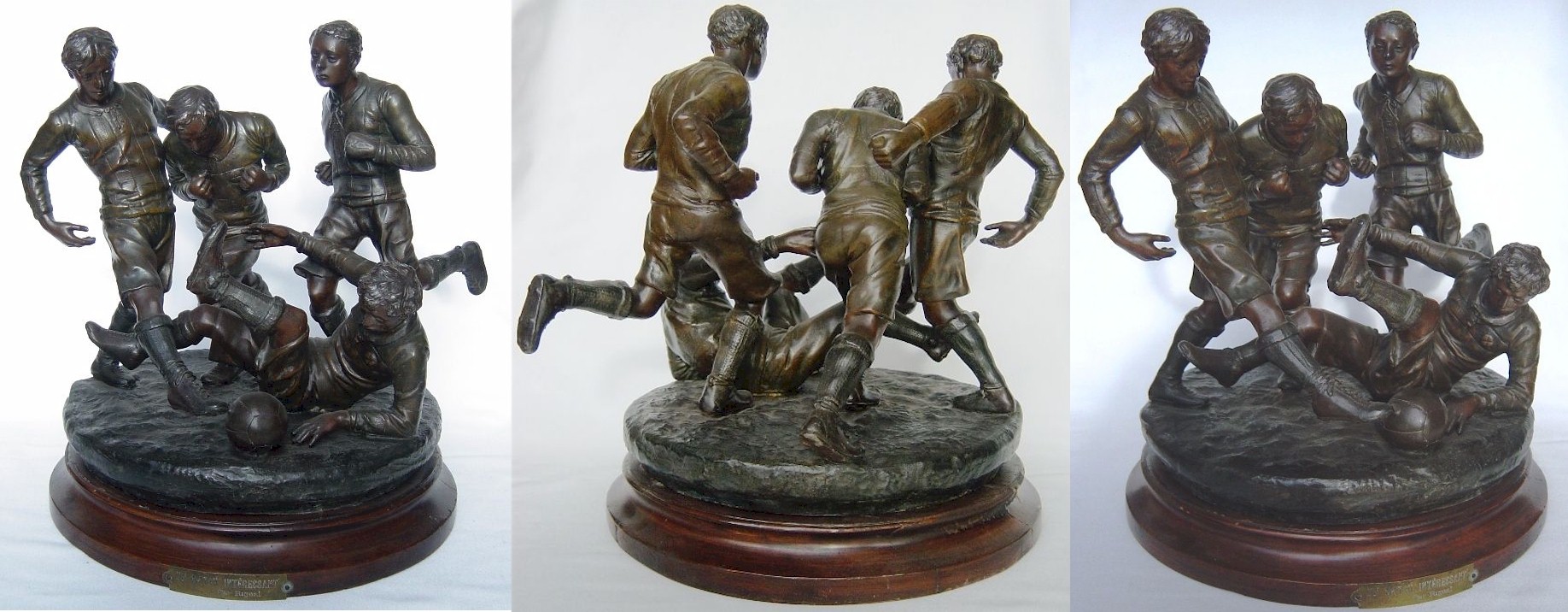 've only seen three examples of this statue in all my travels, and one of those three only had three players...The title plate of one of the other examples was engraved only "Football" as opposed to "un match interessant par Rigual" this example is inscribed. The statue is French so there are sure to be more scattered around Europe...but it can certainly be termed as rare. In the art world,  anytime more than one person is depicted in sculpture, it's referred to as a "group"...The more people the more complicated the work. That is...the more complicated it was for the sculptor to render it...and the more complicated it was to cast...that's partly why you don't see many "groups" of antique sports sculpture...