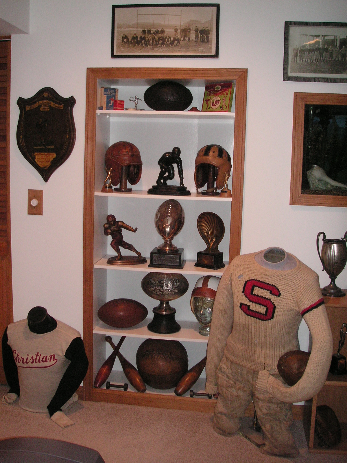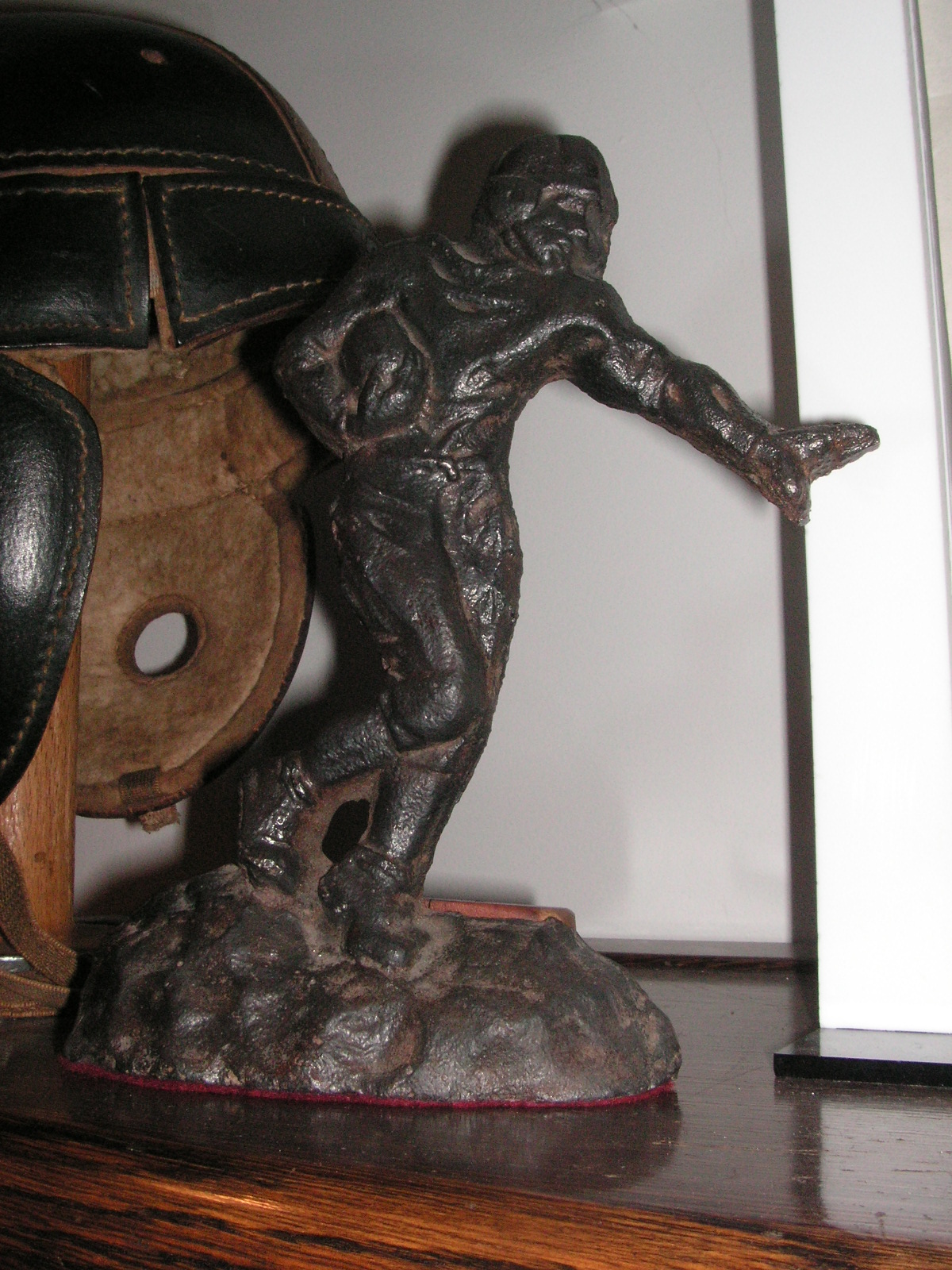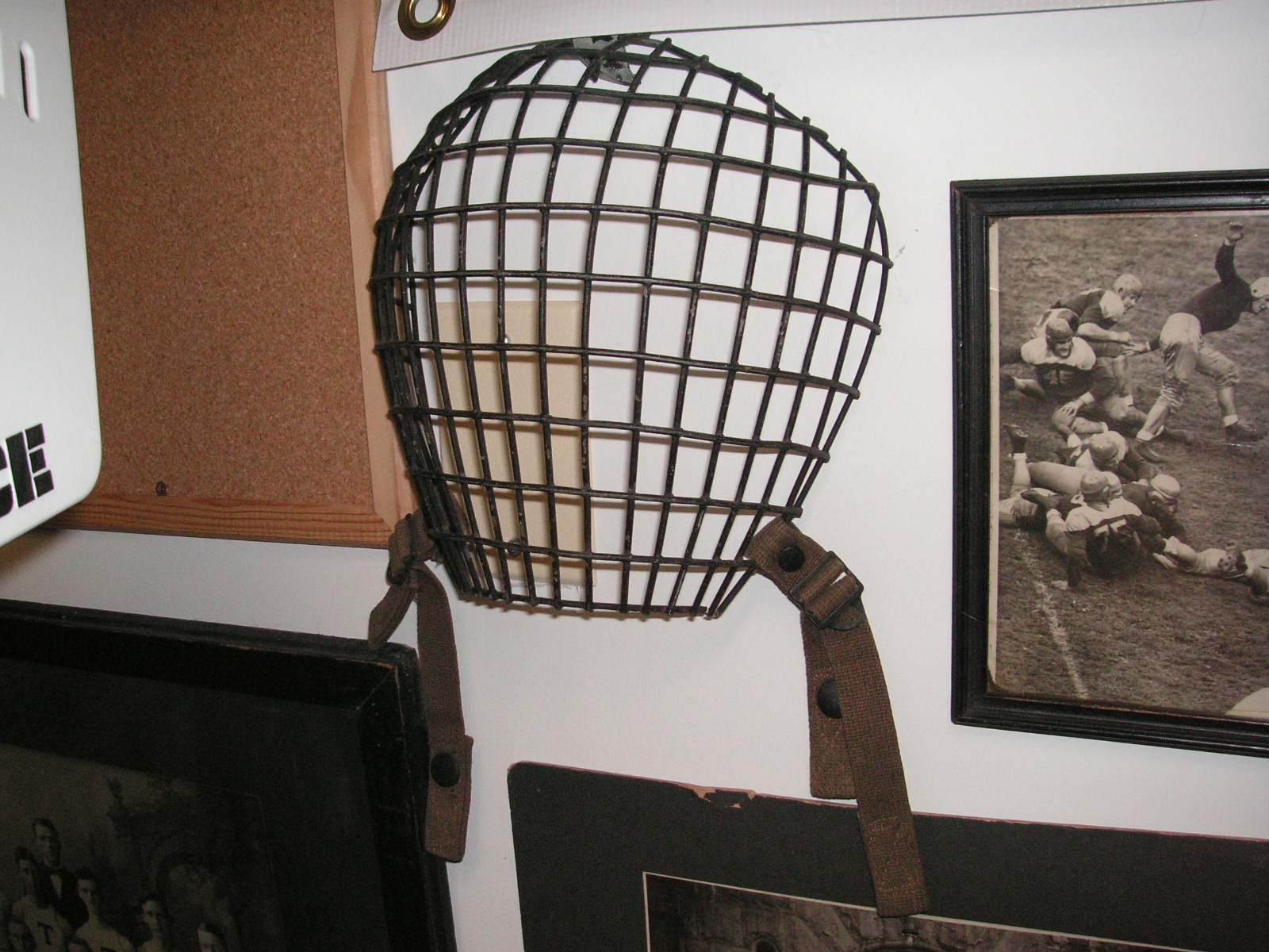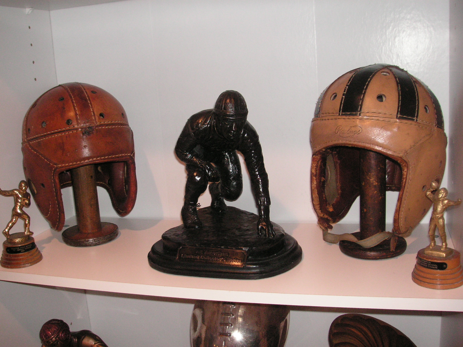 "I've been collecting vintage football items for about 13 years. I started by just wanting 1 leather football helmet. Loving the game of football so much as a player and coach, I was intrigued with the roots of the game. I searched every antique shop I came to with no luck for over a year. My parents found 2 old 1940's leather helmets at an antique shop in Wisconsin and bought them for me for Christmas 13 years ago and that was the start of my obsession. I enjoy having a nice assortment of items that span the decades the game has been played. I often wish I could go back and talk to the men who used to