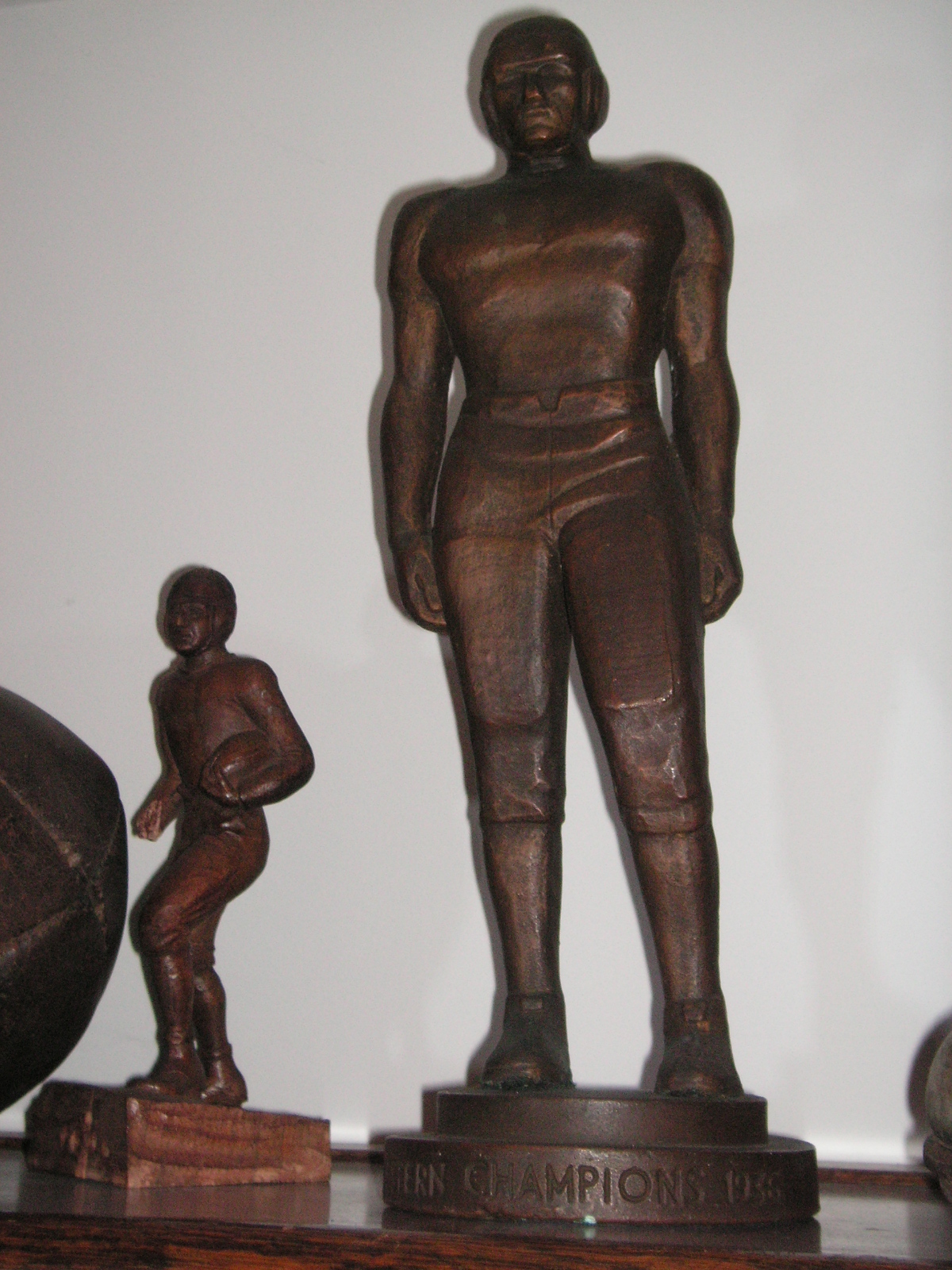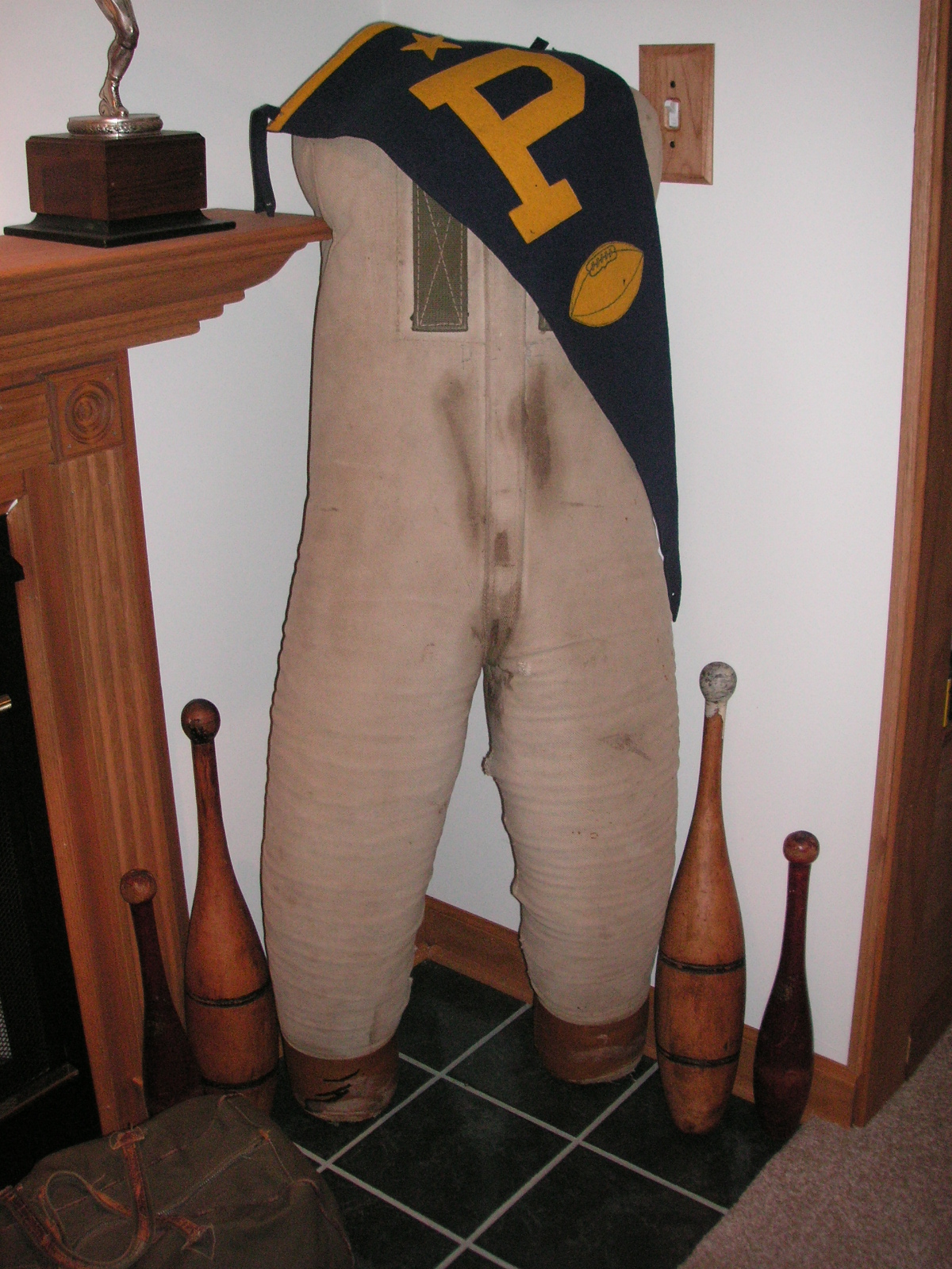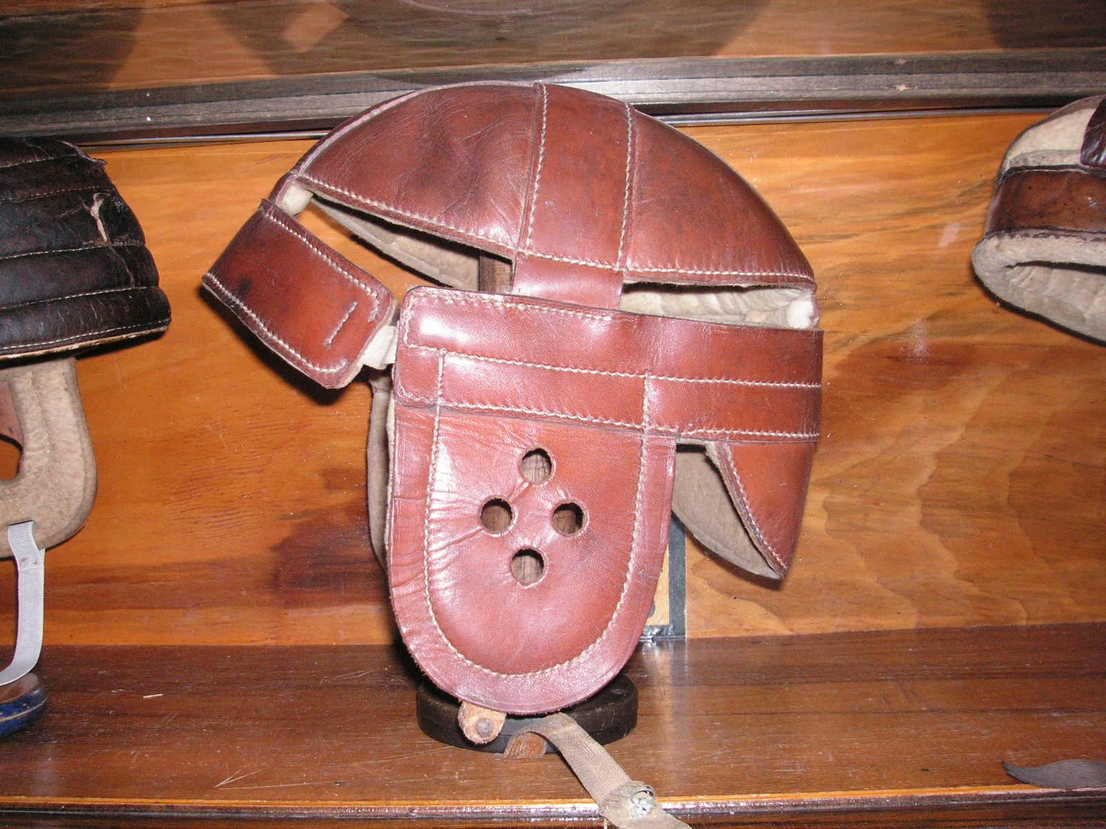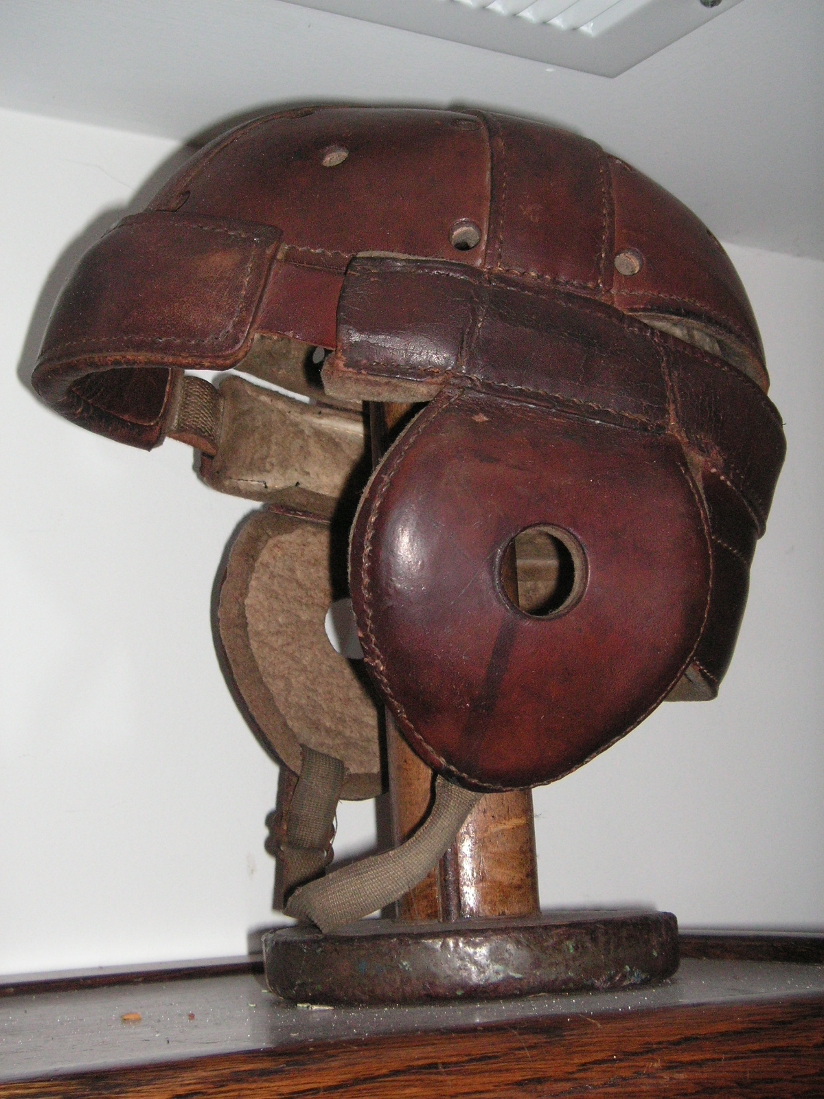 "I've been collecting vintage football items for about 13 years. I started by just wanting 1 leather football helmet. Loving the game of football so much as a player and coach, I was intrigued with the roots of the game. I searched every antique shop I came to with no luck for over a year. My parents found 2 old 1940's leather helmets at an antique shop in Wisconsin and bought them for me for Christmas 13 years ago and that was the start of my obsession. I enjoy having a nice assortment of items that span the decades the game has been played. I often wish I could go back and talk to the men who used to
