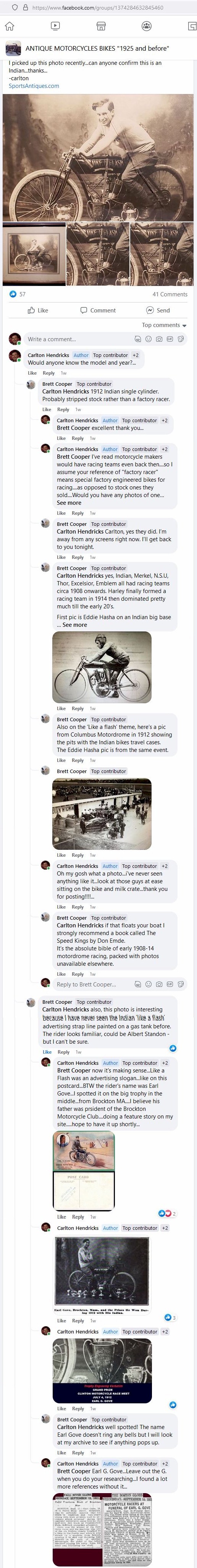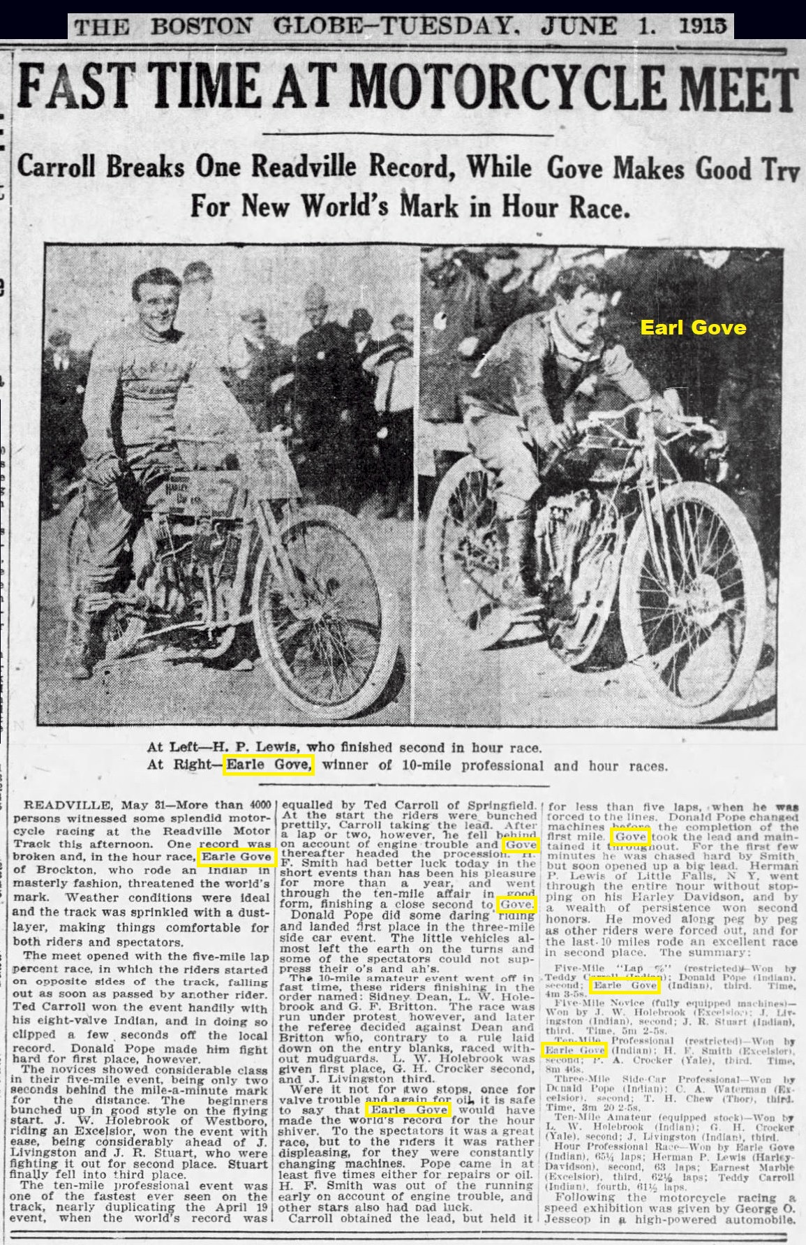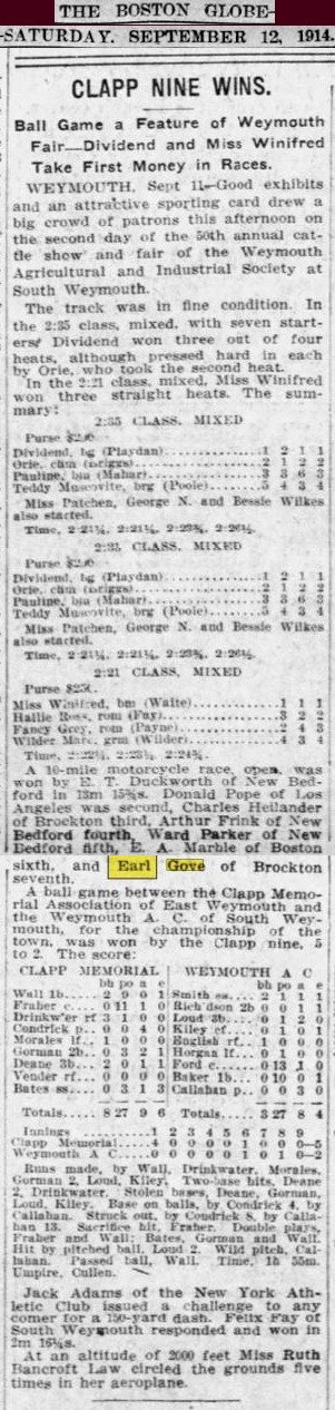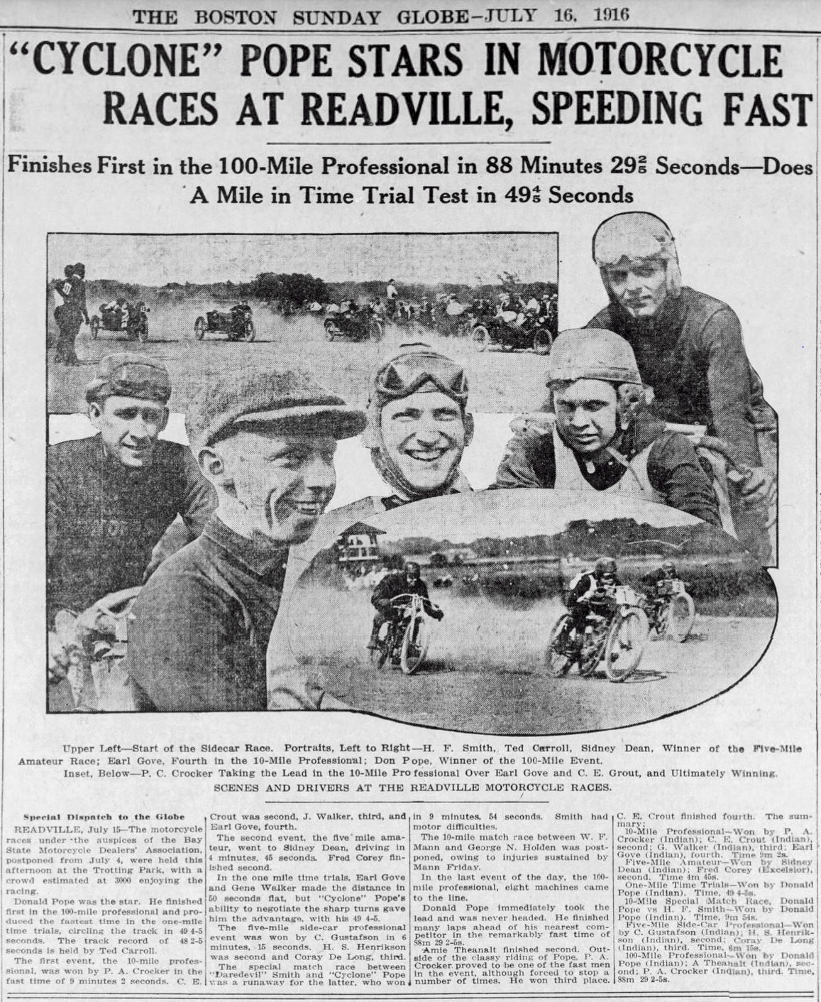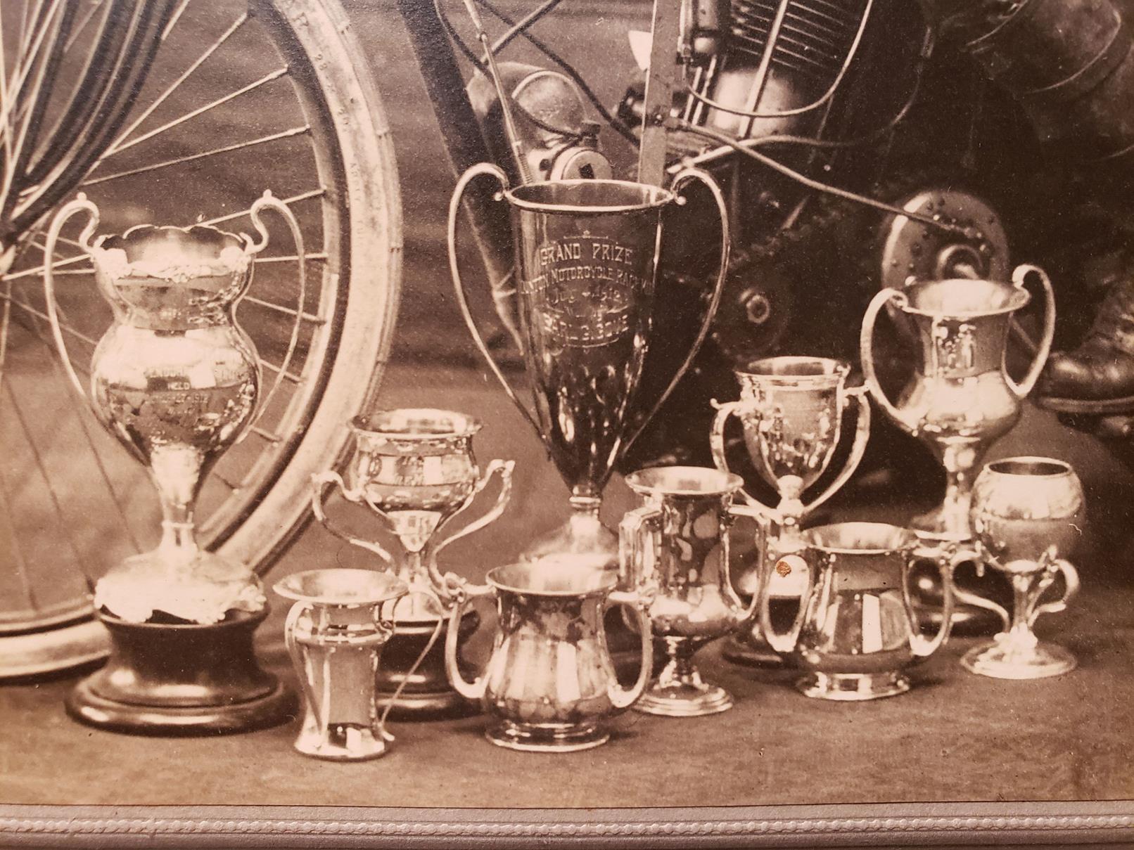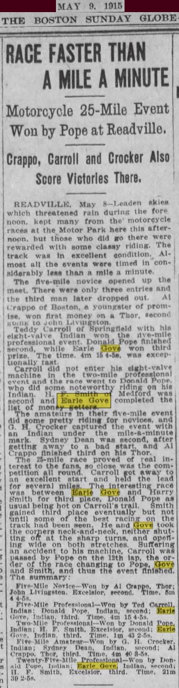September 12th 1921 in a motorcycle race at Combination Park in the Boston suburb of Medford…I was able to I.D. him by enlarging the photo and reading the engraving on the center trophy…GRAND PRIZE - CLINTON MOTORCYLE RACE MEET – JULY 4TH 1912 – EARL G.