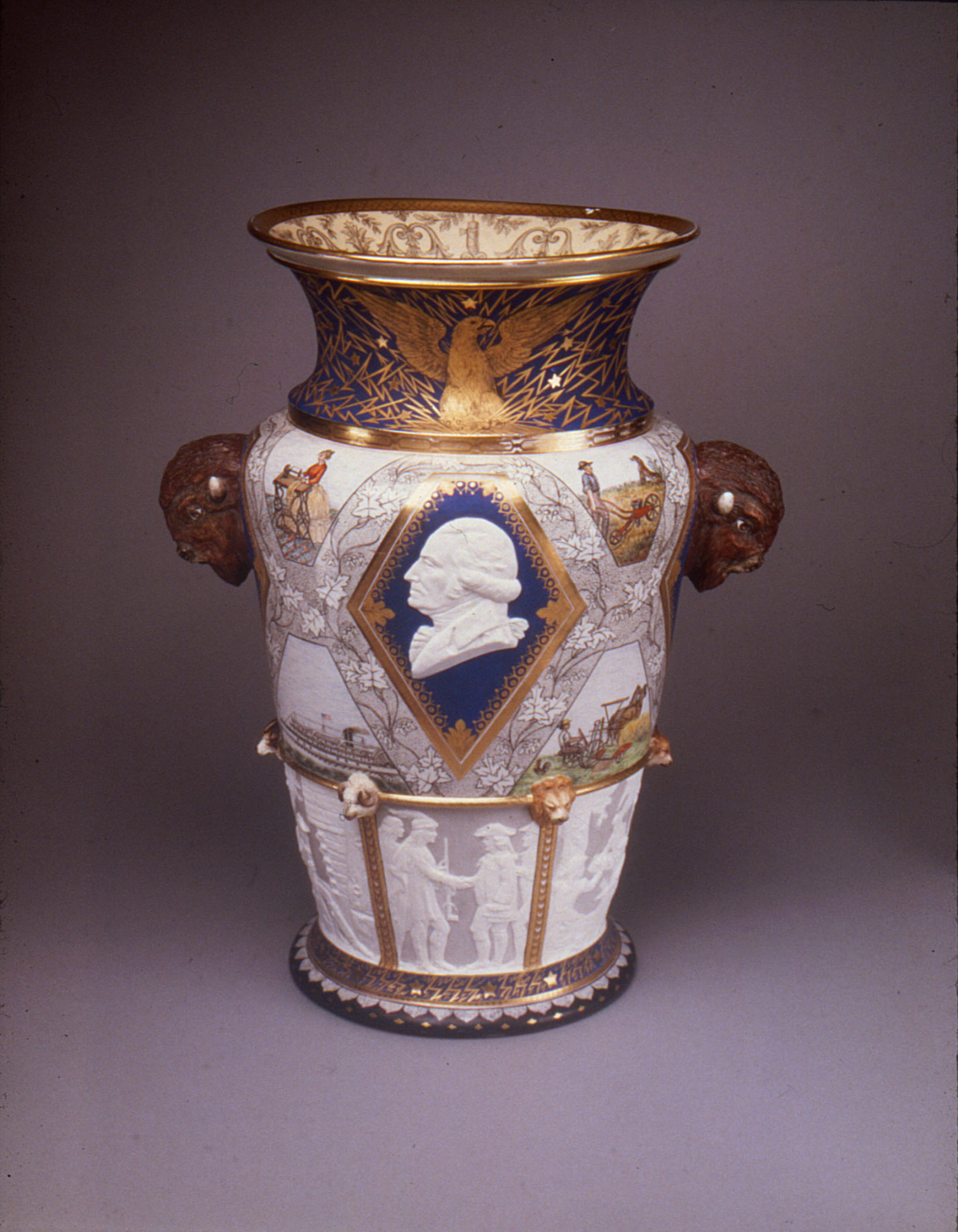design depicted various scenes from American history in relief as well as painted illustration. All its depictions revolved around a central relief bust of George Washington. On each side sculpted buffalo heads served as handles. Also circling the vase were small sculpted heads of a lion, ram, dog, walrus, fox, and bison.