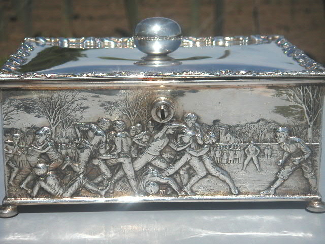 It appears around half the Reed and Barton designers were foreign born and trained, as was common in the silver industry. The influence of the European training these designers brought with them, no doubt lent its self to designing the many varied styles of decorative silver, which the American public demanded in the late 19th century. The English, who have long been very proud of their sporting history, employed the same style of Bas-Relief work in their early sports plaques that was used on our football box. It’s very possible Beattie or another English born designer may have drawn their inspiration from such works, when designing our box.