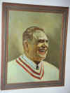Painted by a professional artist, this incredible oil painting captures a lively, smiling Pop Warner, wearing a tie and classic V-neck sweater with the Stanford colors of red and white. This great painting was in excellent condition, with the original frame, and was painted on thick paperboard. The painting is signed F.H. Fear - 32 - Interestingly, the artist apparently also noted the exact date he painted it, as the top part of the backside reads