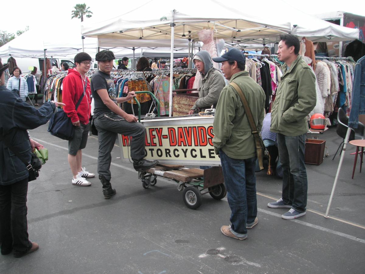 signs…So forgot about it and moved on….a few hours later I was going thru the back part across the bridge…where all the vintage clothing dealers are…so I’m walking along and I see an Asian guy pushing the Harley sign on a cart…so I go over and start talking to him….very nice guy named Danny….very interesting…I didn’t tell him I already saw it on the other side….I asked how much he would sell it for…said wasn’t for sale….and that he would be shipping it to his store in Thailand…Said he has an international client base….sells a lot of stuff to Europeans…