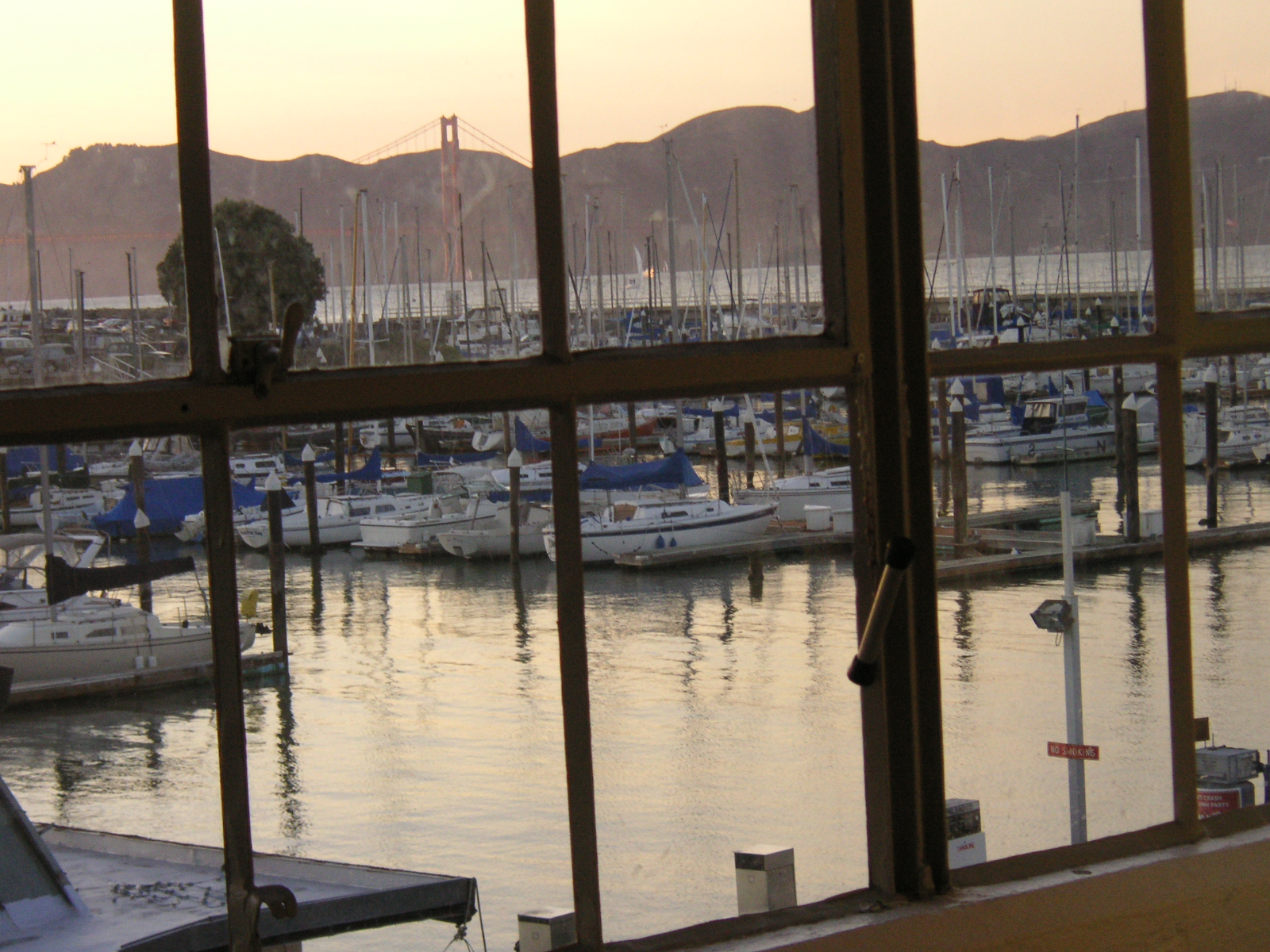 Fair entrance   View of San Francisco bay from window inside fair, Golden Gate Bridge in distance